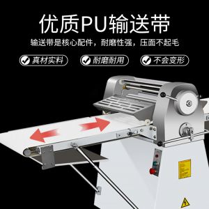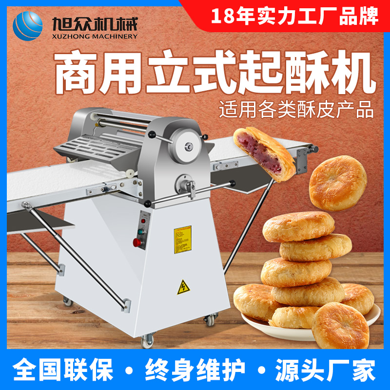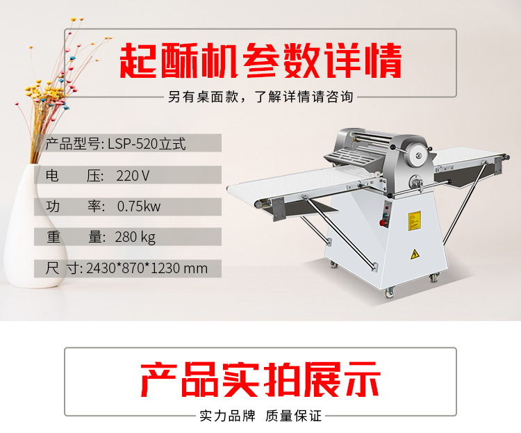 LSP-520酥皮機,采用獨特的鏈輪傳動替代了傳統易磨損的塑輪傳動,低噪音,高壽命滾輪經過特殊工藝處理,不粘麵,不易刮傷適用於手撕麵包、羊角麵包、蛋撻、老婆餅、千層餅,等酥皮類食品,也可用於輾壓麵團。